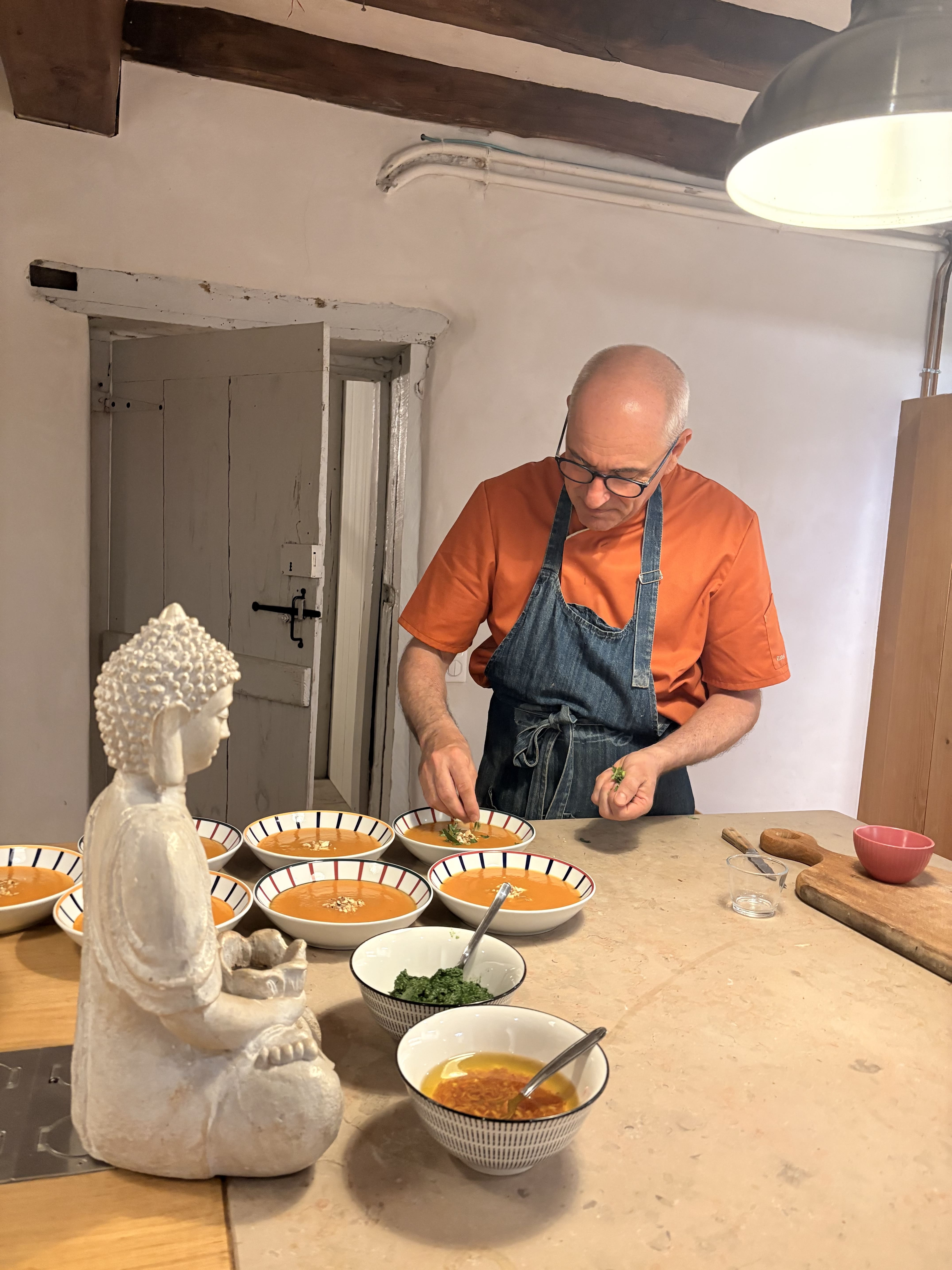 Du jeudi soir au lundi soir, chaque repas sera un véritable voyage gustatif, orchestré avec amour par Philippe, notre chef Basque. Au menu : des plats végétariens, préparés avec des produits bio, locaux et de saison, qui célèbrent saveurs, couleurs et équilibre.